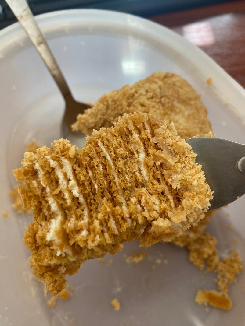 «Вот он! Тот самый, настоящий медовик!» — плясала я с кусочком на тарелке. Коржи нежные, ароматные, тающие, хорошо пропитываются, довольно мягкие, но держат форму, не раскисают в кашу. Торт получается достаточно высоким, красивым, ровным. Как любому медовику, очень важно дать ему пропитаться и настояться хотя бы ночь. Но по прошествии этого времени торт не проседает и почти не уменьшается в высоте, что в некоторых случаях критично. Этот медовик можно есть сразу из холодильника, но ещё вкуснее он становится, если немного постоит при комнатной температуре. Мммм! Пишу, и снова захотелось его приготовить!:)