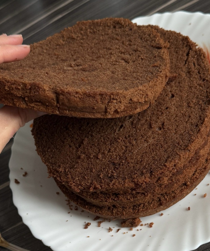 После полного остывания убрала бисквит в плёнке в холодильник на ночь. На утро нарезала струной, с нарезкой особых проблем не возникло. Криво-косо, зато вкусно
